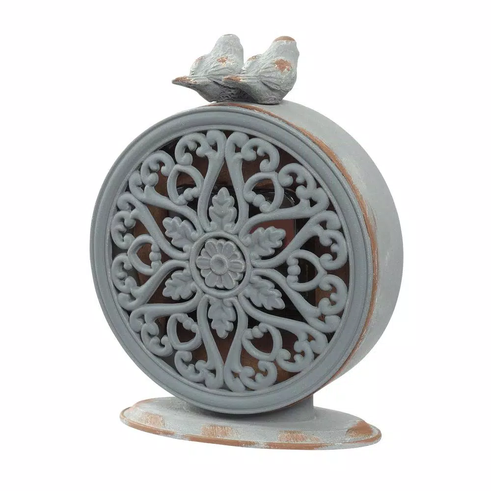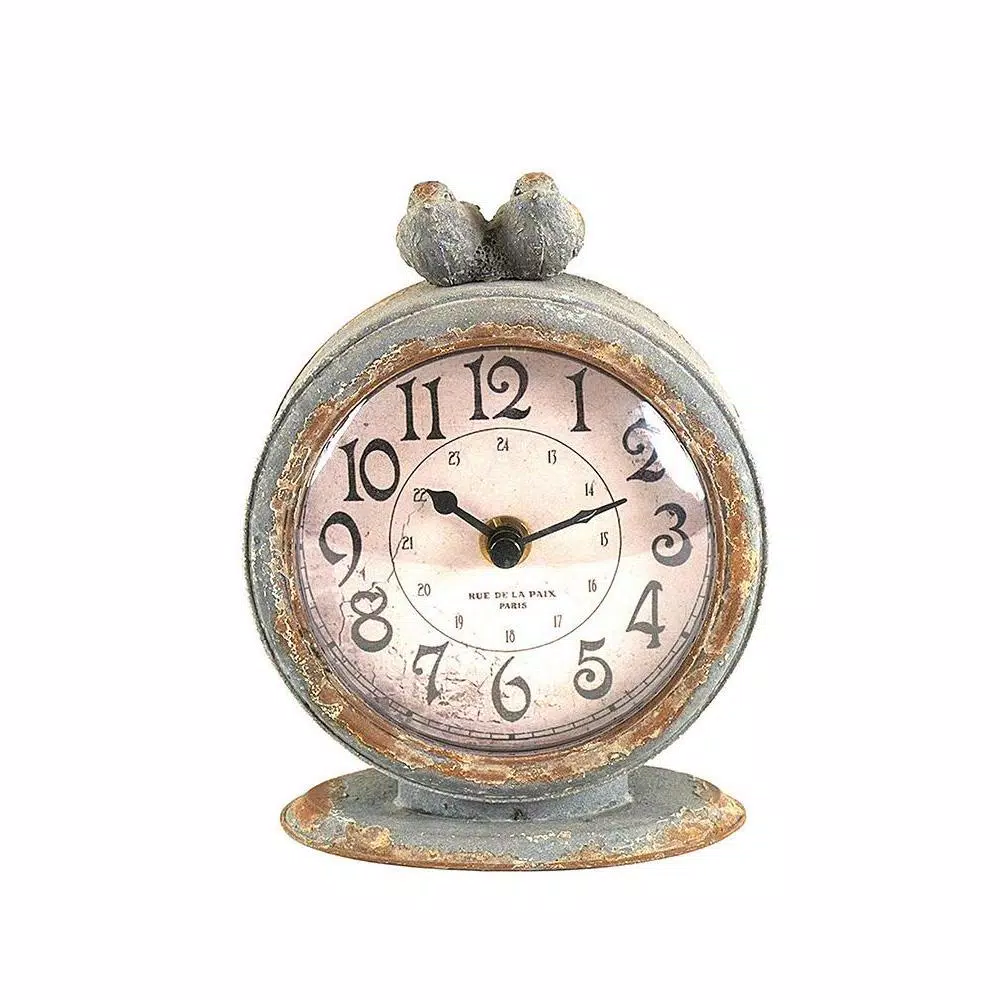 Round out a cottage-inspired aesthetic with this distressed grey mantel clock. Featuring a round silhouette crafted from pewter, this timepiece is accented with two perched birds. The round dial is protected with glass and has bold numerals in black for contrast. Create a refined farmhouse aesthetic in the living room when you decorate using this table clock.