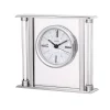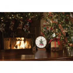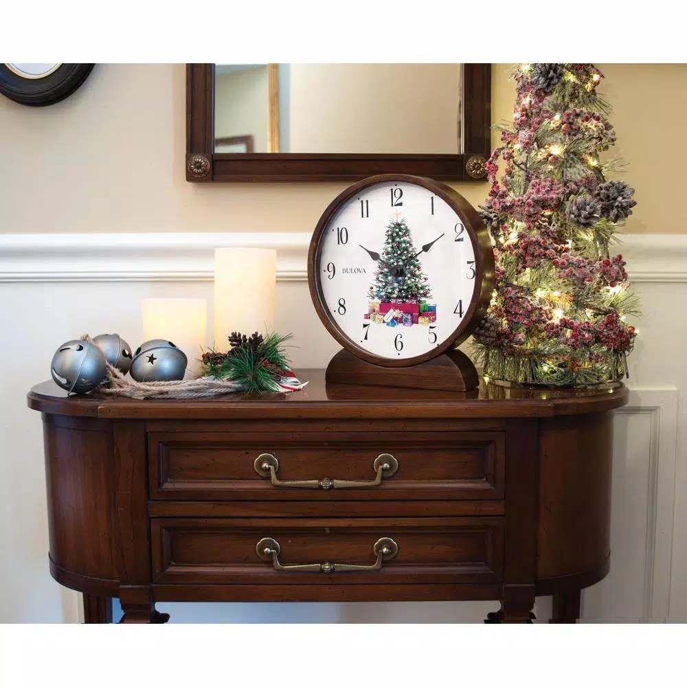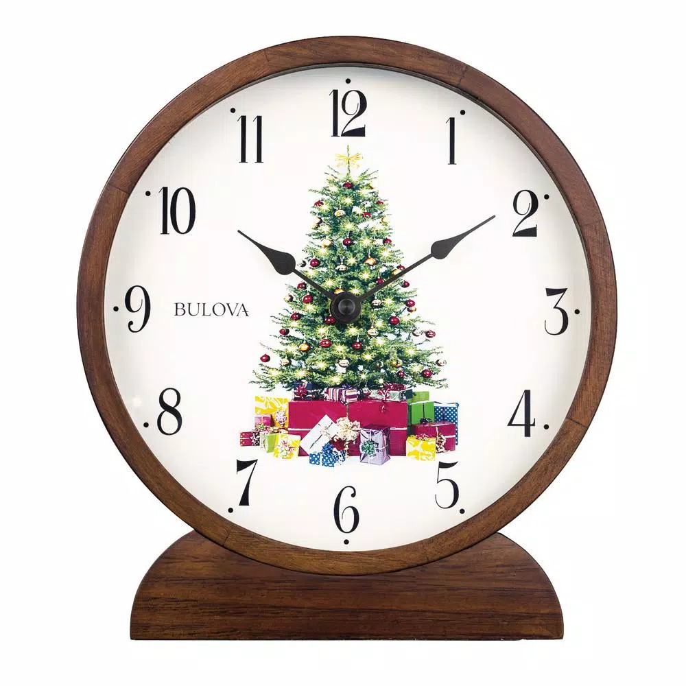 The Holiday Sounds table clock by Bulova is delightfully festive. The solid hardwood case is stained in walnut. Glass lens protects the oversize dial decorated in a holiday motif. Plays 12 beloved holiday tunes randomly per hour, from 8am to 11pm.* With back on/off switch to silence the songs if desired. Requires (3) AA batteries, not included.