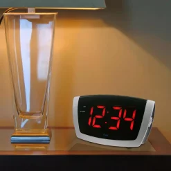 Digital alarm clock features large time and alarm. Manual set and adjustable backlight for proper viewing. Snooze feature for extra rest and AC powered. Requires battery (not included) for backup.