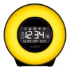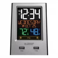 Bright, dynamic LCD screen illuminates this bedside alarm and is power packed with features. Displaying manual time, full calendar view, and shows you the room temperature with humidity. So many options, such as: dual USB charging ports (adapter use only), alarm with multiple settings, and nap timer. Ready for a power snooze? Set the Nap Timer to count down from 120 minutes to 10 (default) for a quick sleep. Greets you a Good Morning or Buenos Dias when you exit the snoozed alarm and indicates a low/weak battery.
