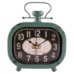 10 in. decorative clock adds style and design to almost any decor. With a weathered teal-green sturdy metal case and antique dial its beautiful to hang onto a wall or sit onto a table or countertop. Battery operated (one Aa sold separately) and itβs easy to set. Metal hands rotate in quiet sweeping movement.