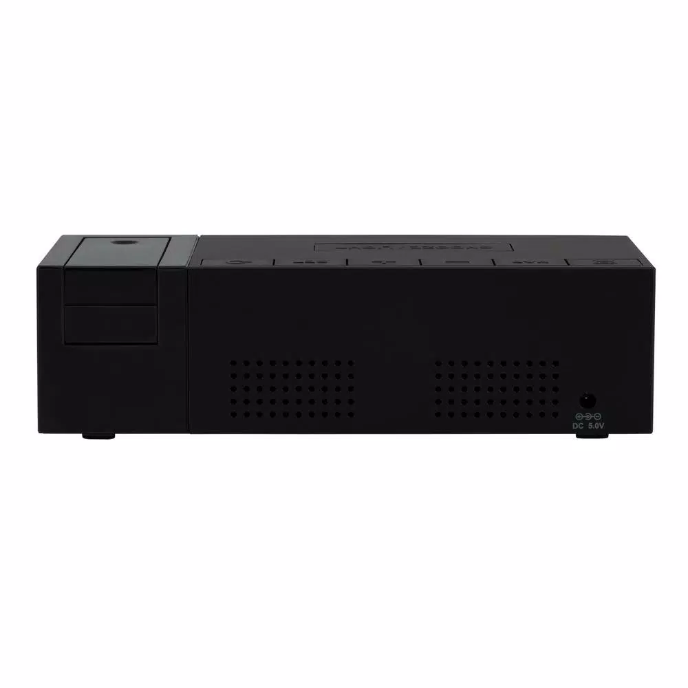 Projection alarm features dynamic color display with brightness control and alternate calendar view. Included adapter powers this bedside clock which will charge any mobile device (charge cable, not included.) Projects current time onto wall or ceiling, with arm rotation for any angle and offers nap function. Displays the ambient room temperature and the humidity.