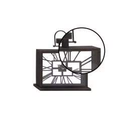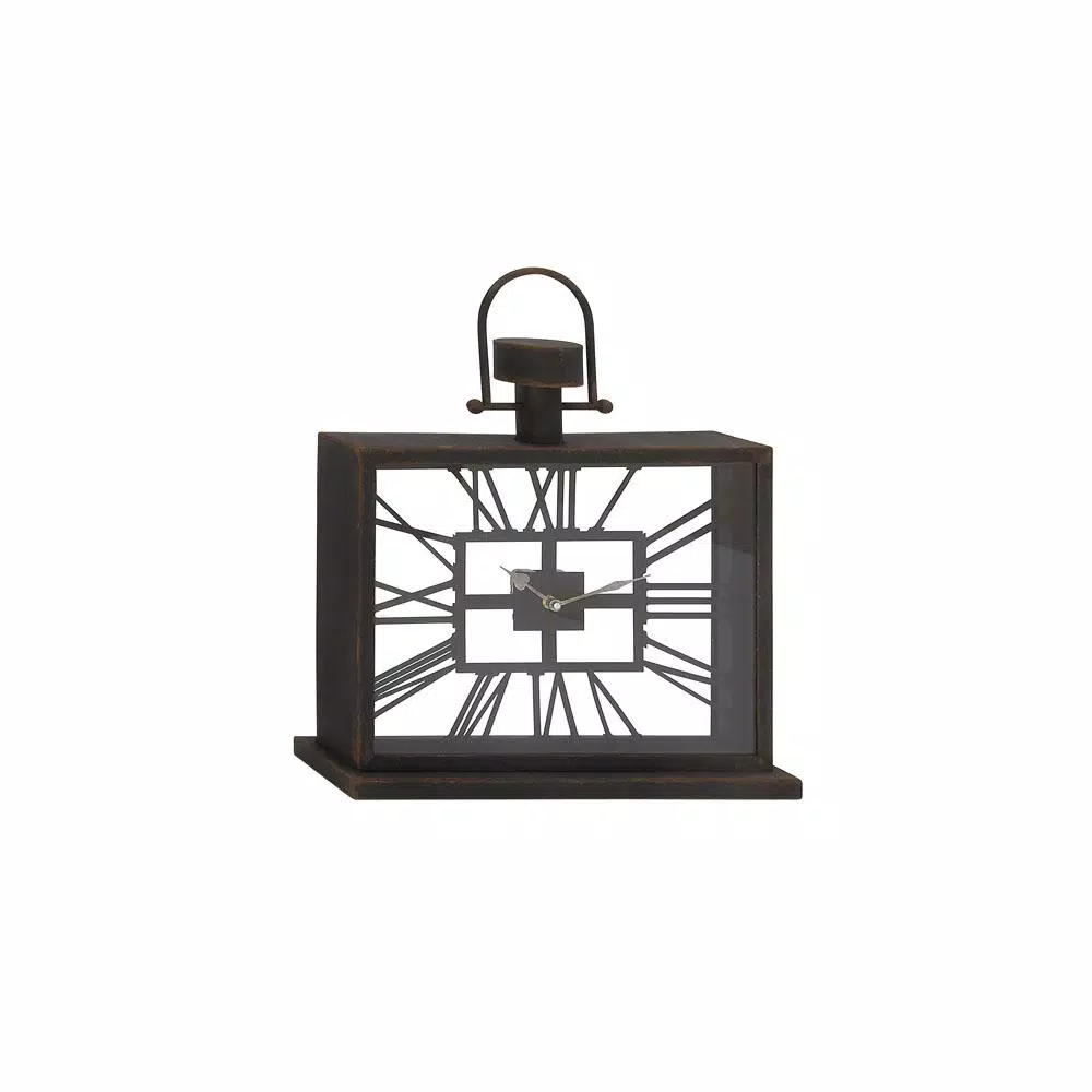 This rectangular table clock features a horizontally oriented clock face with cutout Roman numerals around a center square inside a clear glass cover that conveniently operates on 1AA battery. This table clock is designed with a sturdy rectangular band frame with a decorative top winder and an arched band handle mounted on a rectangular base for stability. This table clockβs rusted black iron and smooth glass finishes create contrasting features and bring elegant rustic vibes to homes and spaces.