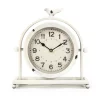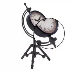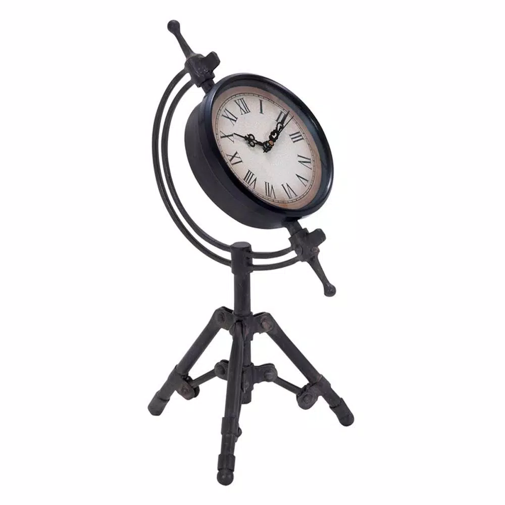 This table clock has a simple classic design that combines a round face with a tilted platform and adjustable tripod legs. The matte black finish on the metal construction gives the piece vintage sophistication. A simply elegant clock to complement your traditional table in your home or office.