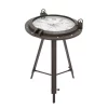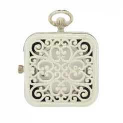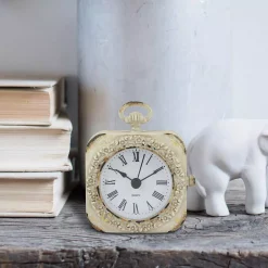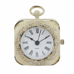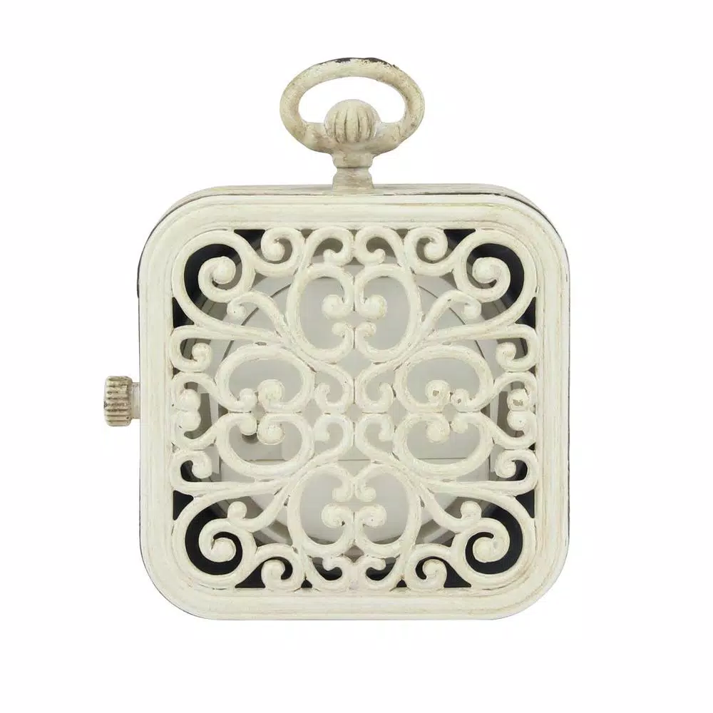 The small weathered white tabletop clock is adorable and is even finished with whimsical details on the back. The clock requires 1 AAA battery that is not included. It is the perfect size for a small desk or bedside table.