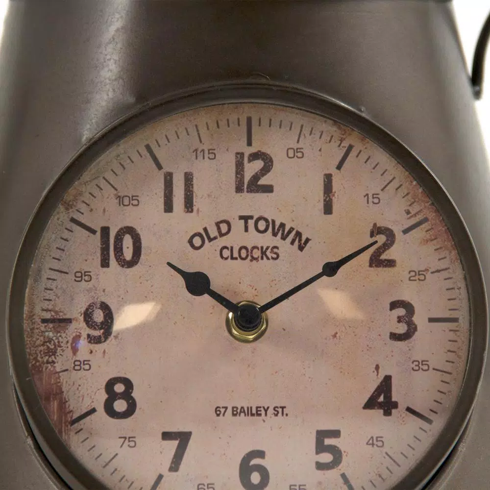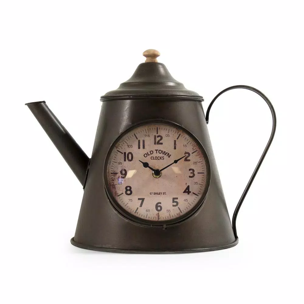 Grab the attention of your guests with the PC066 15.5 in. x 11 in. x 10 in. This quaint country tea kettle shaped clock is made with distressed dark grey iron. It is the perfect kitchen accent for your countertop or sitting room.