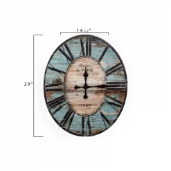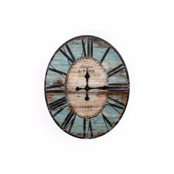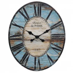 Donβt settle for a simple wall clock to keep you on time. Add this elegant wall clock to your home to add both French country style and function to your home. Inspired by the styles found in Provincial cottages and American country cabins, this lovely accent brings casual charm and unexpected elegance to your home. The large black Roman numerals and the matching black hands give this piece a touch of traditional charm, while the blue and beige finish with distressed wood detailing provide a pop of vintage elegance. This clock also showcases the typographic motif reading βAntiquite de Paris 1887β for added charm. Try hanging this lovely clock in your kitchen to give your space a pop of style and so you can keep your eye on the time while baking and cooking. To complement the style, add some framed vintaged ads and culinary prints to your walls for a beautiful display.