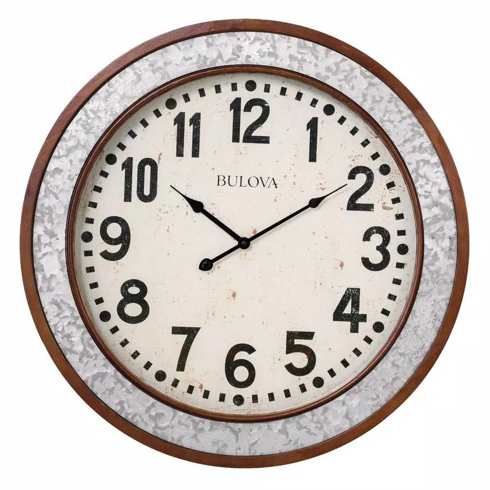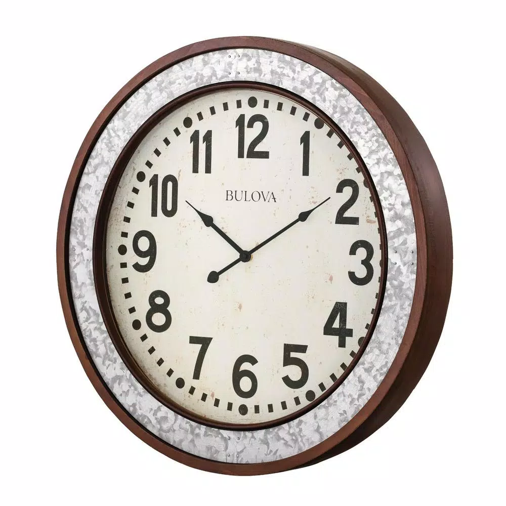 The Grange wall clock by Bulova is a bold design combination warm-cherry finish wood case and galvanized metal inserts. The inserts set off mid-century country style Arabic numbers on a cream dial. It has a protective glass lens and a quality Quartz movement. Requires (1) AA battery, not included.