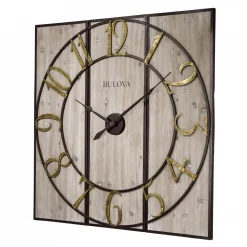 This Vermont Country is a beautiful 45 in. square clock that will be the highlight of your room. Oversize gallery clock designed with eye-catching three-panel metal frame. Bold, raised 4 Arabic numerals in antiqued gold-tone pop against the weathered wood finished in light gray stain. Quartz movement. Clock ships in three pieces for convenient and cost effective shipping. A separate mounting bar is included making it easy to hang. Requires (1) AA battery, not included.