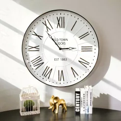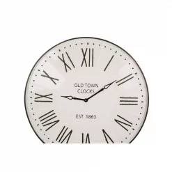 Add a little farmhouse charm to your home with White Metal Wall Clock. This darling metal clock offers an embossed surface, printed black roman numerals, black metal hands, and a painted black edge, with distressed details. Hang it up in a living room, dining room, or entryway for lots of rustic style.