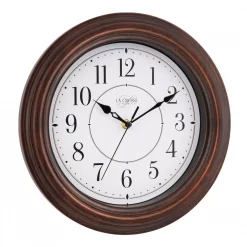 Faux wood look wall clock featuring a rotating sweeping hand movement thatβs quiet not to disturb your atmosphere. Battery operated plastic clock measure 12 in. in diameter with 2.36 in. thick frame. Manually set and will offer you quartz time accuracy.
