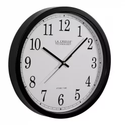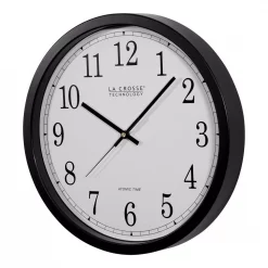 This plastic-framed wall clock measures 14 in. in Dia and looks most at home hanging in an office or business setting. However, this clockβs claim to fame is its precision time-keeping and the fact that it never needs to be set. The clock has a built-in antenna system that receives signals from the WWVB radio transmitter in Fort Collins, Colorado, which is in turn is regulated by the atomic clock. Once you install the battery and choose one of four U. S. time zones, the clock automatically sets to the accurate time in hours, minutes, and seconds, and continues to adjust itself 9 times daily. This low-maintenance clock even automatically adjusts for daylight savings time, so you never need to remember to spring ahead or fall backward. This radio-controlled clock is covered by a 1-year warranty, AA alkaline batteries (not included).