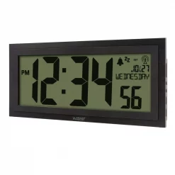 Extra-large atomic digital clock can be seen from across the room or down the hallway. Self-setting time to any of the seven different USA time zones, or if out of 2,000 mile radius of WWVB radio signal range may be used as quartz manual set clock. Optional 12 or 24-hour time viewing mode and temperature settings shown in Fahrenheit or Celsius. Battery operation (requires, not included 3 AA) so is wireless to place almost anywhere. Can be hung onto either a wall or stand on countertop. Icon indicators will show active alarm or WWVB signal or if low power, so you can replace the batteries.