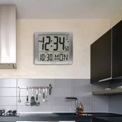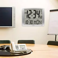 Extra-Large displaying digital clock is wonderful for any large area, lobby, conference room, or office. Receives WWVB radio signal updating the time to the user-set time zone and will automatically adjust to daylight saving time. Choose from 4 US time zones by holding the +12/24 button for 3 seconds, until your zone is selected. Will also work as regular timepiece (must be out of WWVB range) by manually setting the time. Also features extra-large date with weekday display. Requires 3-C batteries (not included) and includes a base stand for desktop use or can hang onto a wall.