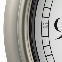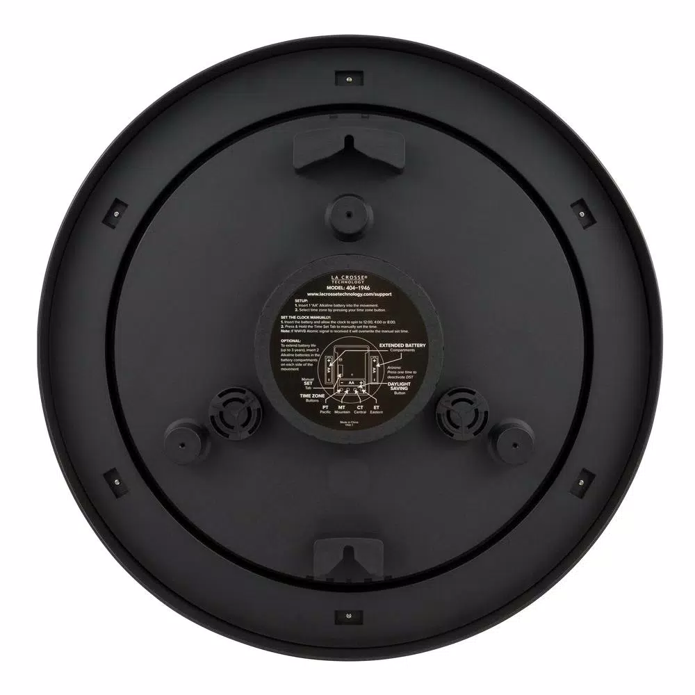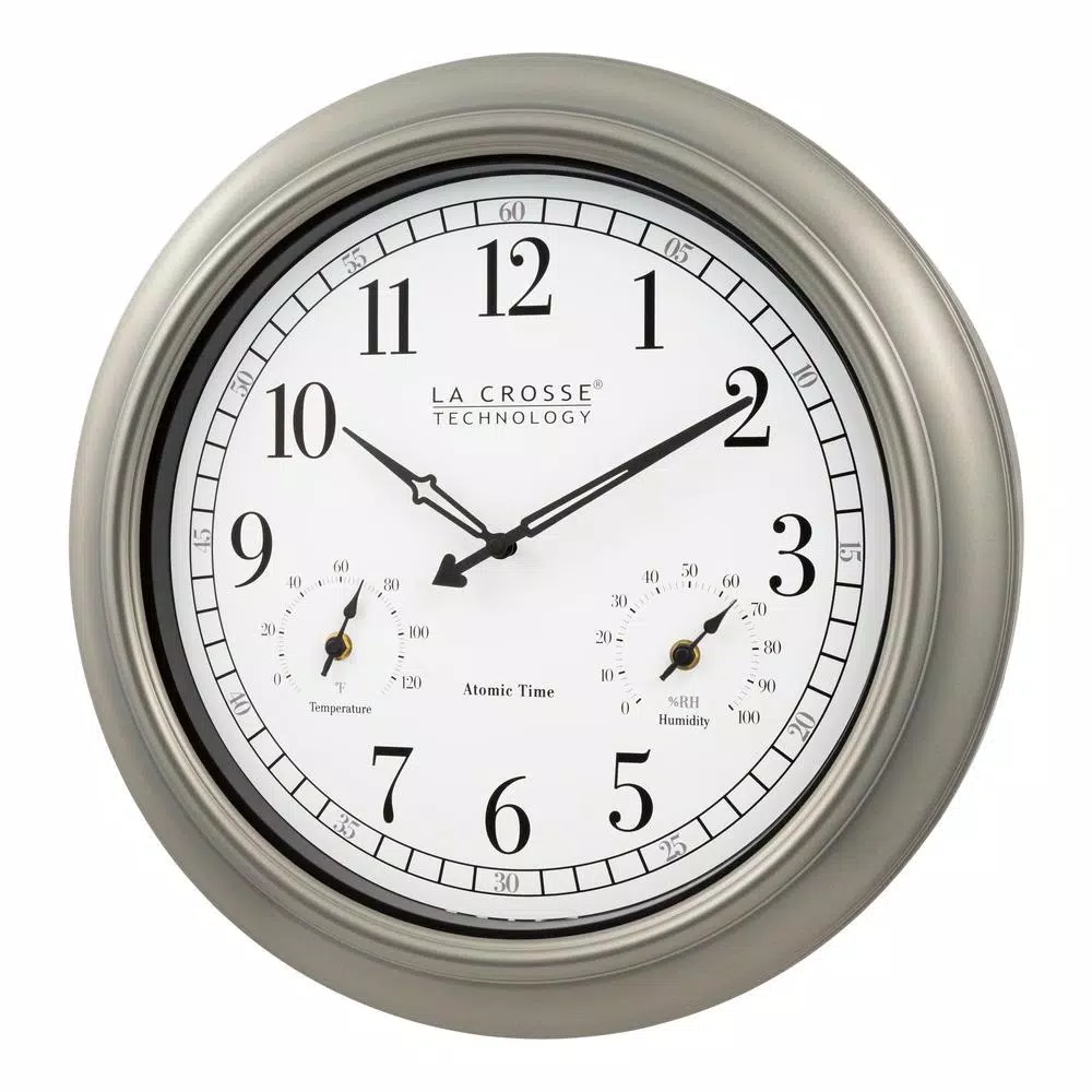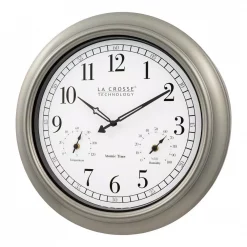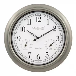 Keep track of time with the utmost precision while barbecuing on the patio, working in the garden, or splashing in the pool with this 18-inch outdoor atomic wall clock from La Crosse Technology. Radio-controlled to automatically set to the National atomic clock in Colorado, and adjusts daily for continued accuracy. Additionally, the clock automatically corrects for daylight savings time. Equipped with a two small analog gauges, it also displays the ambient temperature and humidity to let you know of dry or wet conditions. The hygrometer gauge measures from 1 to 99 percent relative humidity, while the temperature gauge gives readings for temperatures from 0 to 120 degrees Fahrenheit. Surrounded by a sleek pewter-painted plastic frame, the clock face features black 1 1/2 inch high numbers for easy visibility. Elegant, black metal hands tick off the hours and minutes. On the backside of the clock, the user selects the appropriate US time zone; the clock accommodates Eastern, Central, Mountain, and Pacific times. A manual reset button is provided. To ensure accurate readings, hang the clock in a dry area out of direct sunlight. This clock requires the separate purchase of one AA battery for operation with an optional compartment (2 additional) to extend clock battery life. A one-year limited warranty covers this item. The clock measures 18 inches wide by 2-1/2 inches deep by 18 inches high.