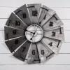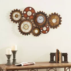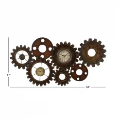 This industrial-themed wall clock features various-sized gearwheel figures for a dramatic touch. It has two faded white clock faces designed to add more vintage vibes. This decorative wall clock will work well in any rustic and traditional rooms.