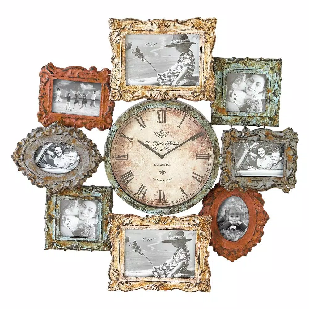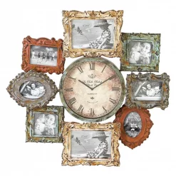 This Victorianesque wall Montage of 8 photo frames and Center Clock sits an impressive 25 in. high. It boasts dramatic finishes, using Distressed Ivory, Verdigris and Russet Hue Iron colors. Added embellishments include Vintage Style Graphics, Scalloped Relief Frame Moldings and Roman numerals.