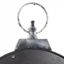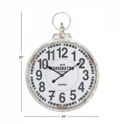 This classic round wall clock has a rustic design with its sturdy iron frame that features a decorative finial. The distressed white finish on the frame blends with the distressed white clock face, creating a shabby chic touch. The classic Arabic number markings plus the traditional spade clock hands make the piece look elegant and vintage.