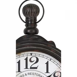 An Updated Traditional Round Vintage Wall Clock with an Ebony Finish Wood Case and Ribbed Ball Finial. This 39 in. high clock includes a Hanging Loop as well as hanging hardware behind the unit. A Distressed White Wood Dial with Black Numerals and Graphics adds a dramatic touch.
