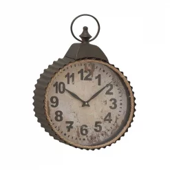 This industrial-themed wall clock features a distressed and rustic clock face enclosed in a corrugated iron frame and an inner brown rope. Its rustic appearance is highlighted through its vintage white MDF face and faded black numerals and hands. This clock will bring an instant vintage touch to any room.