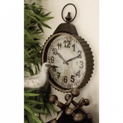 This industrial-themed wall clock features a distressed and rustic clock face enclosed in a corrugated iron frame and an inner brown rope. Its rustic appearance is highlighted through its vintage white MDF face and faded black numerals and hands. This clock will bring an instant vintage touch to any room.