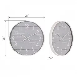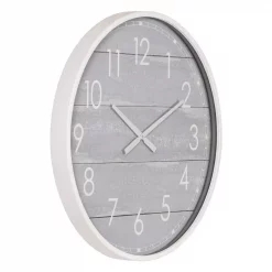 Add a farmhouse rustic touch to you decor with this 28 in. Gray Washed Wood Plank Round Wall Clock. Inspired by vintage time pieces, this wall clock blends traditional and vintage style seamlessly. Constructed of durable metal in a white finish, the clock face features a woodgrain background in a distressed grey washed finish with large easy-to-read white standard numbers. Hangs securely to any wall surface with durable hanger on back. Requires one AA battery.