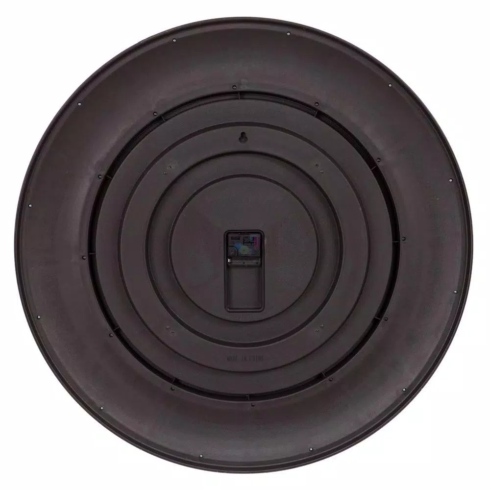 Add a classic touch to you decor with this 30 in. Glenmont Distressed Black Wide Framed Roman Numeral Wall Clock. Inspired by vintage time pieces, this wall clock blends traditional and vintage style seamlessly. Constructed of durable plastic injection in a smooth black finish, the clock face features a black background with distressed white roman numerals. Hangs securely to any wall surface with durable hanger on back. Requires one AA battery.