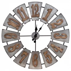 - Wall clock frame is constructed of beautifully distressed metal and raised clock numbers are crafted from solid wood for a dimensional effect