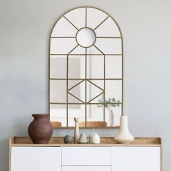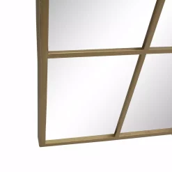 Accentuate your living space with the Medium Arched Gold Windowpane Classic Accent Mirror from Home Decorators Collection. The metal frame features a majestic arch with windowpane-style accents that add a touch of sophistication to your decor. It has keyhole hooks on the back for hassle-free mounting. With its striking gold finish, this exquisite mirror is sure to enrich your classic home decor.