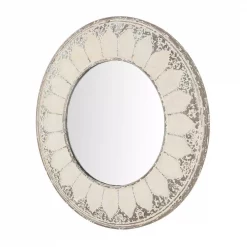 Accent any wall in your home with the Medium Round Ivory Antiqued Classic Accent Mirror from Home Decorators Collection. It features a metal frame with a distressed ivory finish that complements a classic-style decor. You can hang the mirror conveniently using the D-rings that are mounted on the back. In terms of maintenance, simply wipe the mirror using a soft cloth and standard glass cleaner.