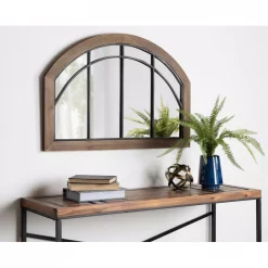 The Haldron Wood Arch Mirror embodies the casual feel of a timeless aesthetic. Our version of this traditional style mirror includes a decorative natural iron fretwork and a wide wood profile finished in a rustic brown. Meant to be hung horizontally, it will provide radiance while balancing a rooms ambiance. The mirrorβs internal metal fretwork is an impressive detail inspired by a classical window design. It features a textured rustic finish that adds a dramatic touch to the interior metal design and mirror underneath. This decorative piece is a great addition to your traditional and themed rooms. It comes with metal D-ring hangers attached to the back for easy wall mounting. This wall mirror is ideal for above a sofa, over a mantle or any wall space that needs brightening and interest. In entryways, bedrooms or hallways this arched mirror will create a stunning reflective window wall. The outer display dimensions are 36 in. across by 24 in. high. Give your living spaces a visual makeover while illuminating the area with this beautiful arch mirror.