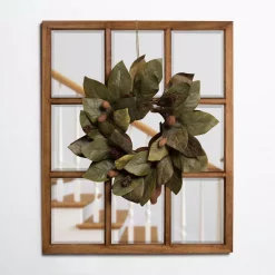 The warm hues of a rustic caramel finish convey the calm elegance of the Kate and Laurel β Hogan 9 Windowpane Wall Mirror. Itβs the perfect piece to enhance and brighten a room in a beautifully understated way. The nine individually beveled mirrors within the window pane frame create the illusion of outside while maintaining the cozy warmth of the inside. Constructed of solid wood, it is classically styled and durably built. This mirror comes with four D-rings installed on the back, positioned so that it can hang horizontally or vertically. Combine two or more of these mirrors above a couch or artfully hang in an entryway β it will not only visually expand a space but will also illuminate and define making the area lighter and welcoming. A mirror like this would work well above a kitchen table drawing the eye up and creating the feeling of height or just what a bedroom needs as a unique and exciting focal point. Itβs a well thought out accent piece that can transform an ordinary room into a gorgeous, luminous space. The outside dimensions are 26 in. x 32 in., and each mirror within the nine panes is 7 x 9 in. The frame profile is 1.25 in. wide, and the inside sash bars are each 1 in. wide and about 3/4 in. deep.