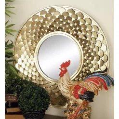 This elegant wall mirror features a rustic-inspired design with its concentric and raised semi-circle scale pattern. It is designed with a stunning distressed gold finish that will make any wall look classy and attractive. This decorative piece features a round reflective mirror that complements and rustic and classical-themed walls.