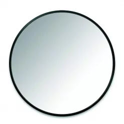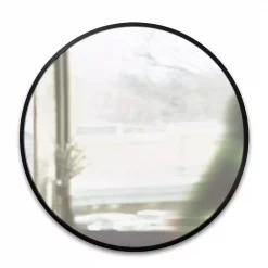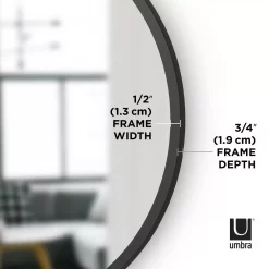 An oversized glass mirror with black rubber rim that makes a statement in any room. The large format mirror helps boost lighting and visually expand a space. Measures 24 in. in diameter by 1-1/4 in. deep. Designed by the Umbra design studio for Umbra โ original, modern, casual, functional and affordable design for the home.